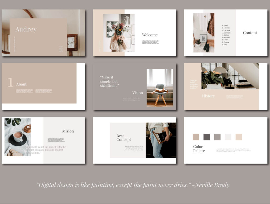 Audrey is minimal brand guidelines Google Slides /Full. Every slide is unique and not just repetitive layout. Just use powerpoint you can create gorgeous brand guidelines for your brand, it’s perfect for digital brand guidelines, marketing kit or for brand presentation. And Audrey Google Slides Template now you can create a powerful and professional deck with a striking design in just a few minutes instead of hours (or even days).