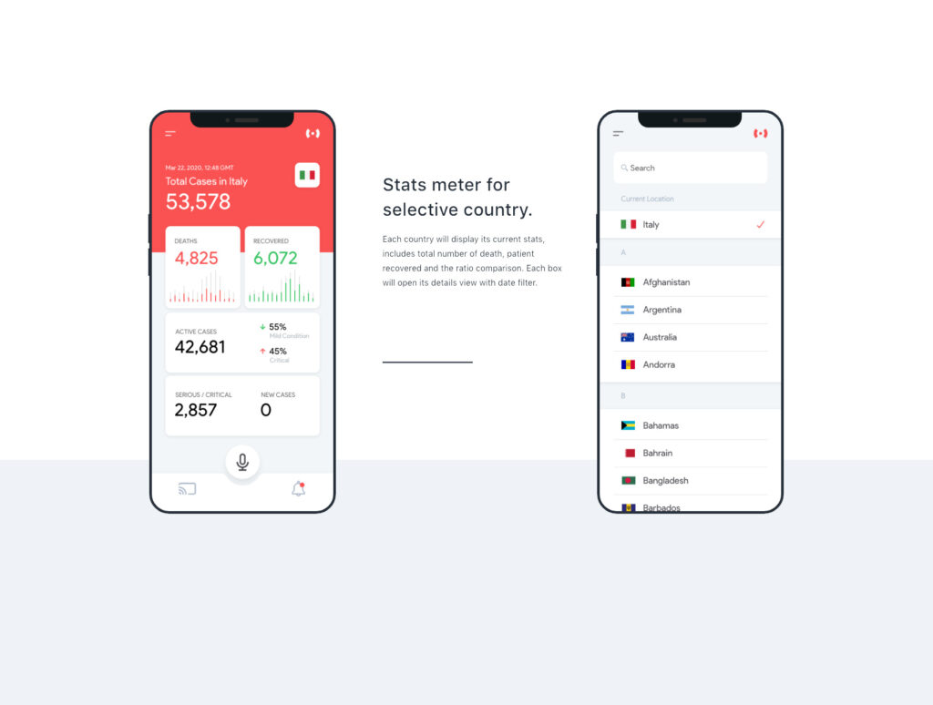 Virus Tracking App Challenge winner UI Kit. Simple UI kit design to get the latest and updated insights and stats for Coronavirus – Covid19. The design also includes a light version of this app.