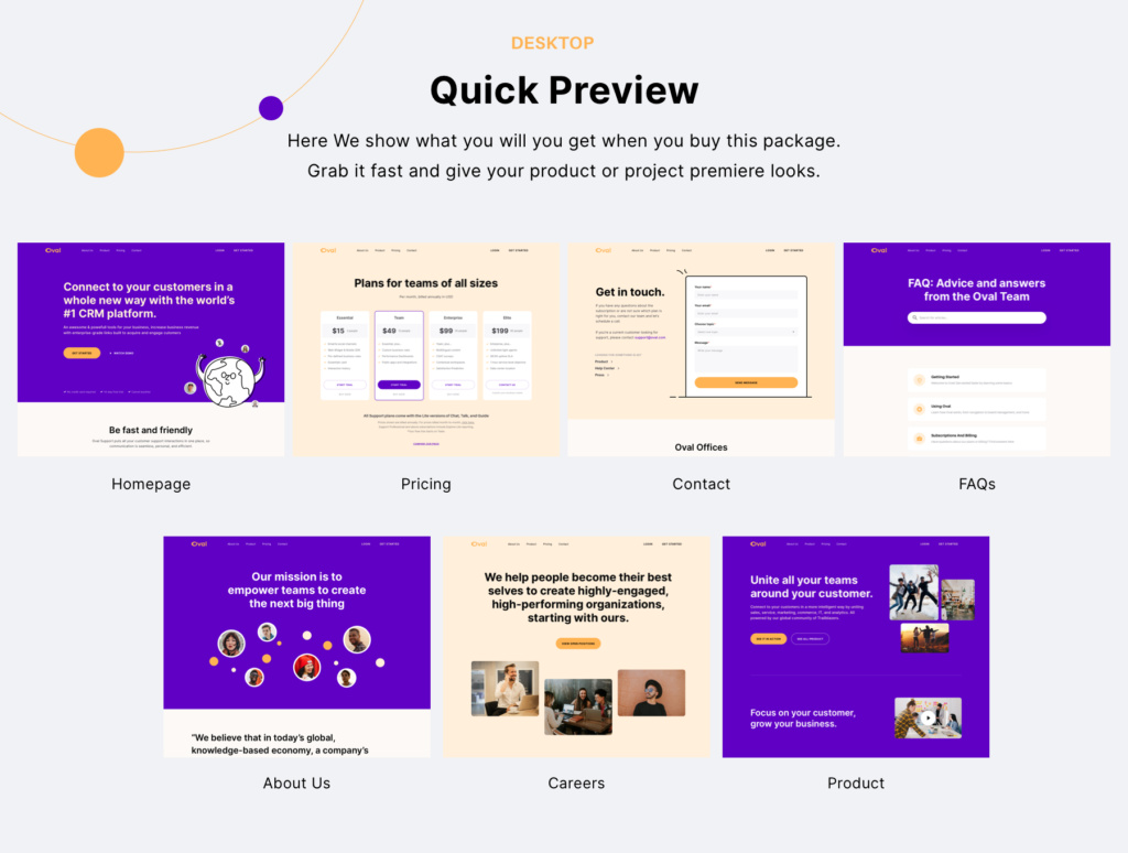 Oval is a series of website design template for some specific niche. We created this template based on industry needs. Every pack includes minimum 7 must-pages for website. In this SaaS Website template vol. 4, you’ll have all designs created in 3 devices design, desktop, tab, and mobile. Check out the preview for details.