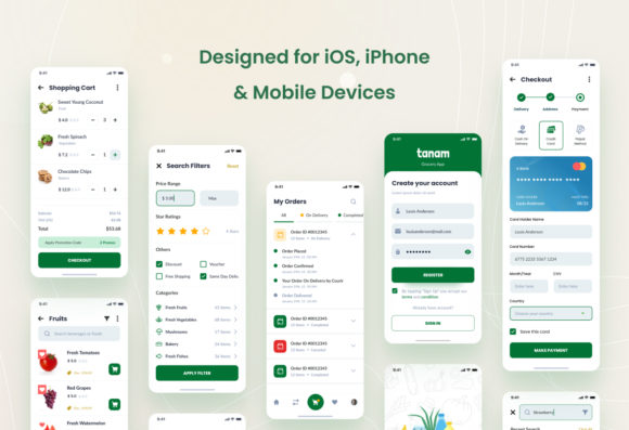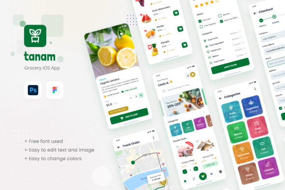 Designed by using clean and neat appearance, using green color as a main color, it gives refreshing sensation to anyone using the apps. Every package of this grocery application template consisted of 15 pages from the walkthrough, sign-in and sign-up, home, search filter, search result, product, product details, shopping chart, shipping address, payment form, my order and tracking orders.