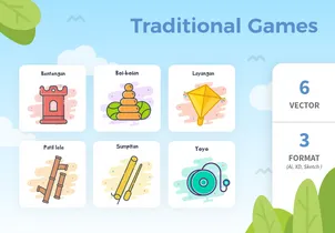 In this bundle we create 6 traditional game illustrations in vector style like a preview (Layangan, Bentengan, Patil lele, Yoyo, Sumpitan, and Boi-boian).