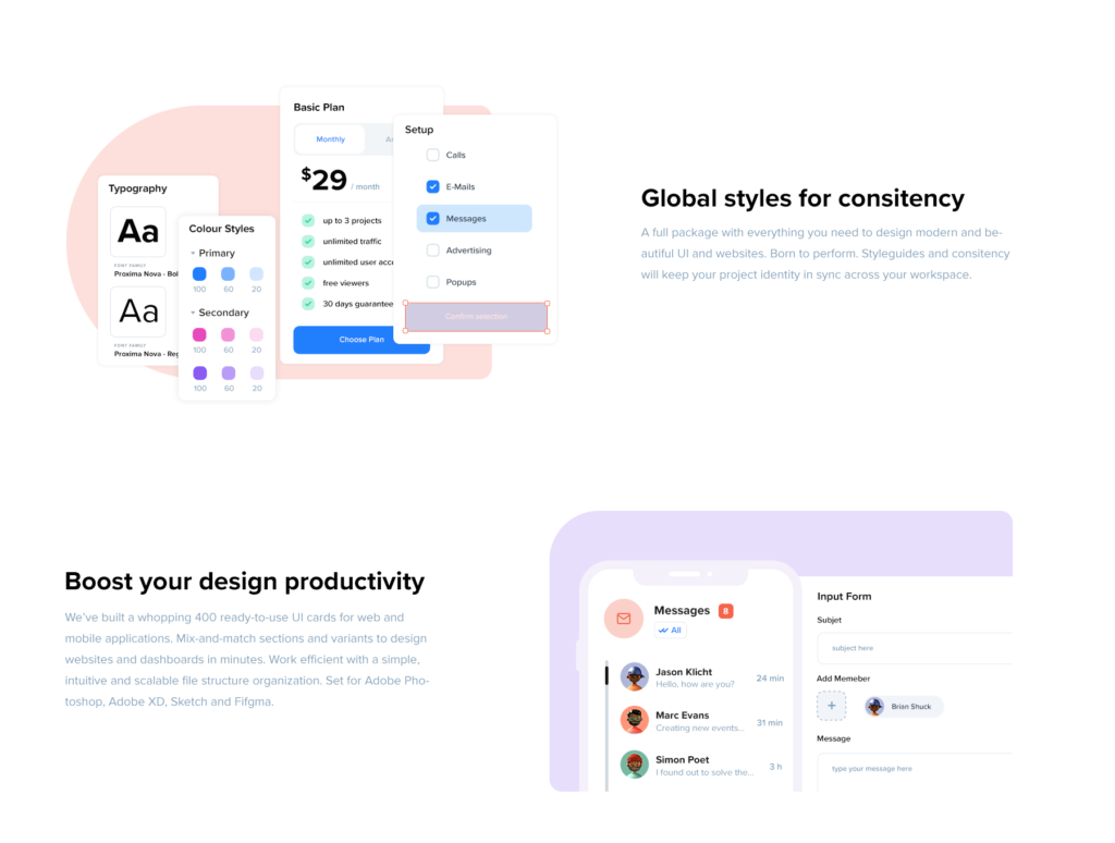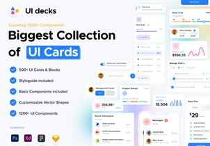 UI Decks is a collection of UI cards and blocks for mobile and web applications. With a big library if UI blocks and cards you can easily edit and customize layouts which definitly speed up your design process. Containing 500+ blocks from 12 categories to cover the most frequent use cases. A basic styleguide with common components and typography assets is included as well. A variety bunch of categories allows you to create custom projects for client needs. For example Crypto, NFTs, Project Mangament and many more. Everything you need in one package to collaborate tighter, create faster and present better designs.