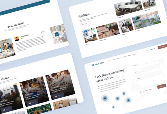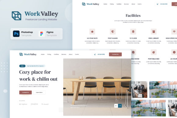 Modern website User Interface design template for a Coworking space or open office. This template is ideal for a coworking space, open office, office rental, and any renting website. Make your website design looks stunning and eye-catching using this template. This template includes 6 unique and modern User Interface screens in PSD and Figma format. You can easily edit and customize using Adobe Photoshop and Figma.